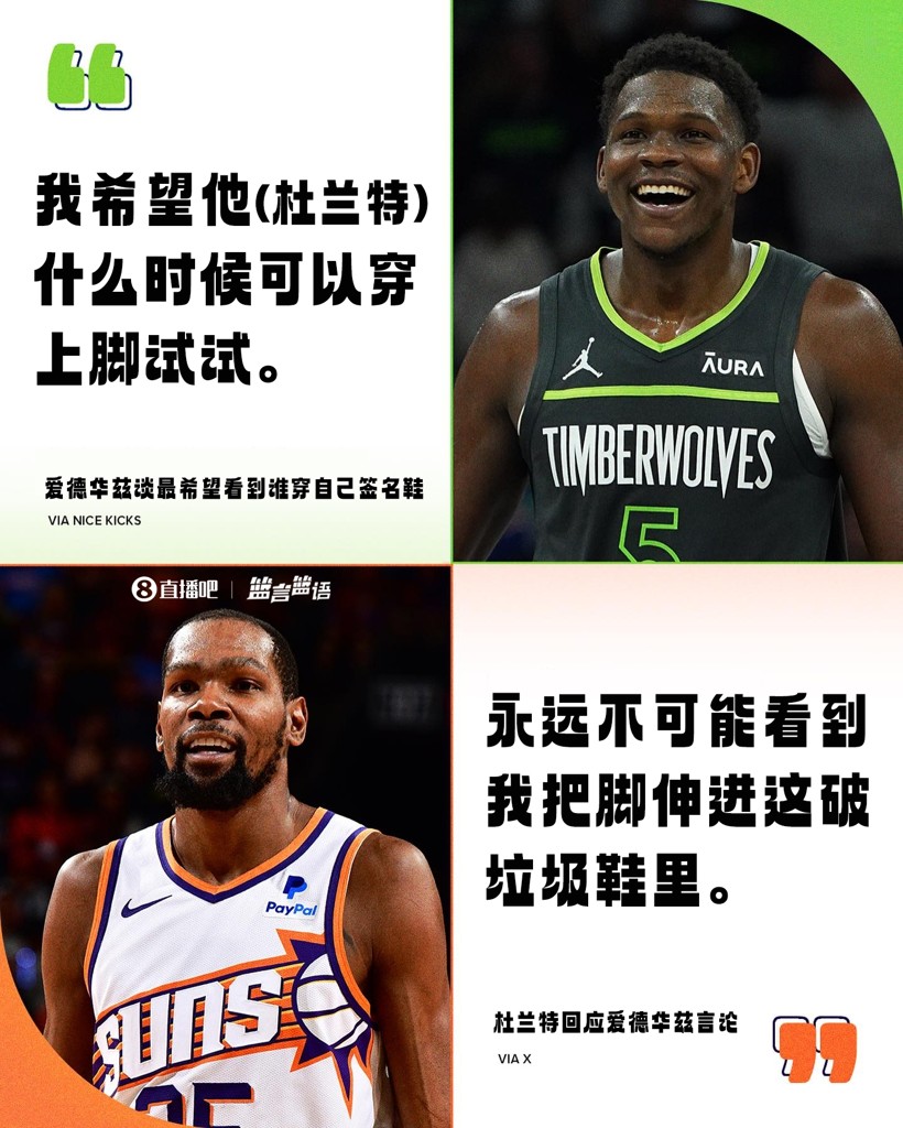 这次爱德华兹再次被问到此事,当被问及是否还是最希望杜兰特穿自己的签名鞋时,爱德华兹说:“是的,我不会改变,我仍然最想让他穿。”